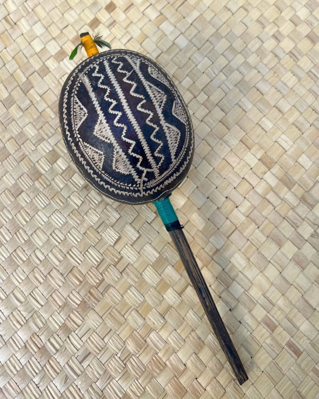 Este Maracá vem do povo Shipibo, do Peru – guardiões de saberes profundos e conexões com plantas de poder como a Ayahuasca. Ele é feito à mão com materiais naturais, oferecendo alto nível sonoro e durabilidade.